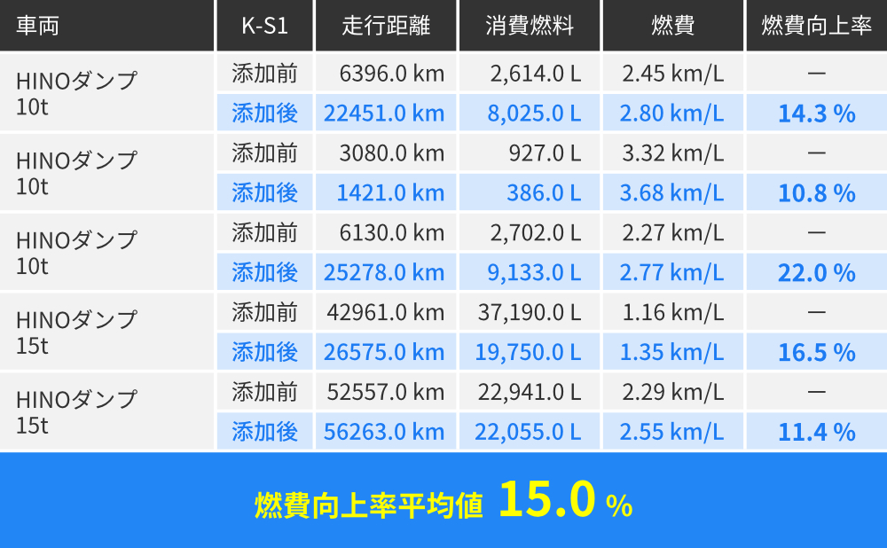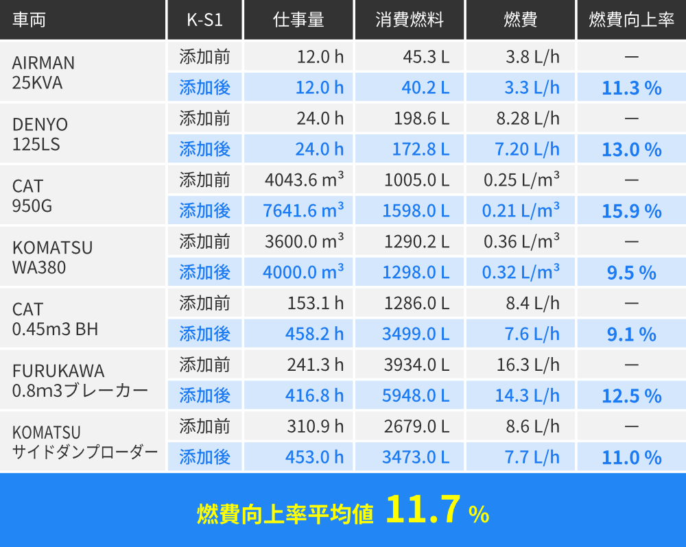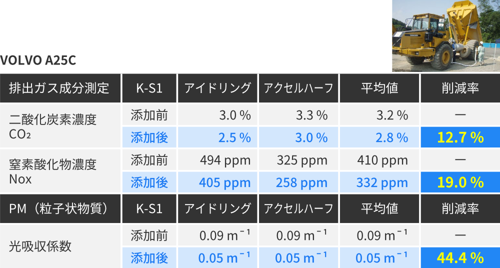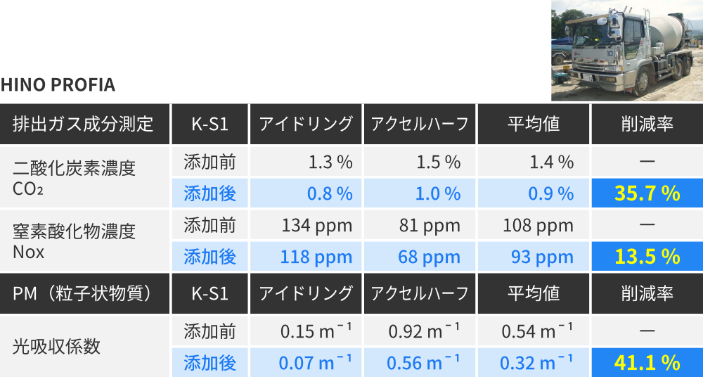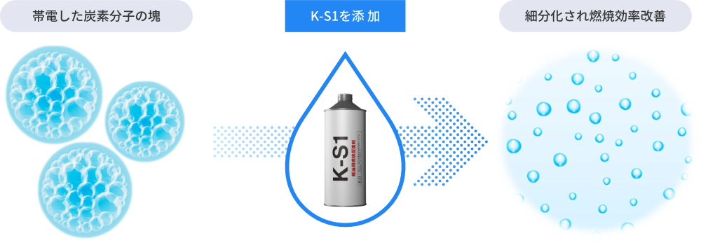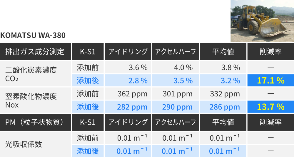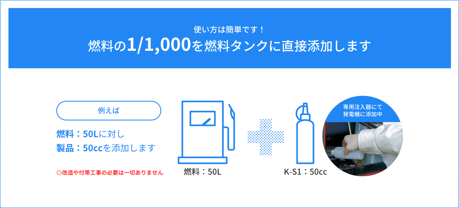 製品情報 製品について Message 燃費・CO₂削減 有害成分削減 安心の軽油100% 公共工事にも最適 製品本体・使用方法 燃費・CO₂削減 有害成分削減 安心の軽油100% 公共工事にも最適 製品本体・使用方法 Message 日本の技術が生んだ 「今からできる、今から始める」 トータル環境ソリューション 金沢大学名誉教授瀧本 昭 地球上に住むものすべてにおいて、持続可能な開発目標SDGsの17のゴールとその169項目のターゲットについて、今まさに取り組むターニングポイントです。私たちはそのことを強く認識し、環境保全に積極的に関わることが求められています。特許登録製品「環境軽油K-S1」が、燃費向上と排出ガス浄化に有用・効果的であると実証・確認されています。本製品は、温室効果ガスのCO₂削減による、ターゲット「13気候変動に具体的な対策」と、窒素酸化物NOxの削減による現場労働者の健康面への寄与は極めて大きくターゲット「3すべての人に健康と福祉を」に大いに役立つことが期待されます。 燃費向上による使用燃料の削減で、 削減燃料分のCO₂は排出されません 自動車や建設機械などが燃料を1L消費する場合、1Lあたり軽油2.58kg・ガソリン2.32kgのCO₂を排出しています。「K-S1」「TK-M1」を添加するだけで、燃費の向上による燃料の削減、排出ガス中のCO₂が削減され、地球温暖化防止への貢献と、燃料費の削減を実現します。 走行テスト結果 排出ガス中のCO₂・NOX・PM等 環境や人体への有害成分を削減 建設機械での有害排出ガス成分削減率 ※東急建設株式会社 国道45号 豊間根トンネル工事にて計測 大型発電機におけるK-S1添加前後の黒煙発生状況比較 動画再生 発電機:(株)新潟鐵工所 ニイガタSEMTビールスティック12PC2-5V型/出力6500PSにて検証 安心の軽油100% K-S1はJIS K2204規格を満たす軽油であり、軽油引取税課税済みの軽油100%で製造しています。 そのため、税法上の問題もなく様々な成分が含まれている他の添加剤と違い軽油の使用が義務付けられている工事や、公道を走行する車両にも安心してお使いいただけます。 燃料の変質無く、燃料を改質し完全燃焼へと近づけます。 製造方法 原材料に軽油を100%使用し、製造プラント内のセラミックスに一定の条件下で接触循環させて製造 メカニズムと原理 〈特許第5700383号〉 帯電し集合体になりやすい炭素分子の静電気を中和させ分離 炭素分子を細分化し酸素との接触面積を増加させ燃焼効率を改善 K-S1で使用している軽油は、指定特約業者より直接課税済の軽油を購入しているため、問題なくお使いいただけます。 不正軽油での抵触無し 公共工事現場等抜取調査での抵触無し クマリン検査・硫黄分析での抵触無し JIS規格・環境条例 軽油の使用が義務付けられている工事でも安心して使用できます。 公道を走行する車両にも安心して使用できます。 ※不正軽油の使用は重大な犯罪行為となり厳しく罰せられます。 ガスクロマトグラフィー試験結果 金沢大学 理工研究域 物質化学 准教授 本田 光典先生による考察 CGチャートを比較すると、軽油単体と軽油+K-S1とでは、それぞれのピークにはほとんど変化無し。 従って、K-S1添加による軽油の変質はないと見なせます。 軽油のみ 軽油+K-S1 製品の安全性に関するデータはこちら 工事での活用 工事での「K-S1」活用により、総合評価方式及び公共工事成績評定での、周辺環境への配慮、地域への貢献、環境保全、創意工夫等での加点が見込まれます。 K-S1使用で高い効果が期待できる工事現場 トンネル工事等 排出ガスが充満しやすい工事現場 作業中の換気・厳しい作業環境等に関する工夫 安全対策に関する創意工夫への取組 病院・学校・市街地付近等の 工事現場 周囲環境の配慮への取組 地元調整・社会条件への対応 自然環境への配慮等が求められる 工事現場 動植物など自然環境への配慮が特に必要な工事 環境保全・地球環境への配慮 工事成績評定加点の流れと弊社工程 K-S1使用決定 弊社工程発注者様へ提出用必要書類の作成 K-S1使用 弊社工程加点アピール・必要資料の作成 評価点数加点 独自調査による様々な機関での加点見解、必要資料、提出書類、バックデータ、試算表の作成、環境や地域へのアピール方法等弊社独自のノウハウで、できる限りバックアップいたします。 製品本体・使用方法 金沢大学共同研究開発製品 使用方法 添加の悩みをすべて解決!K-S1添加済みプレミアム軽油 K-S1Gold 詳細・取扱店はこちら